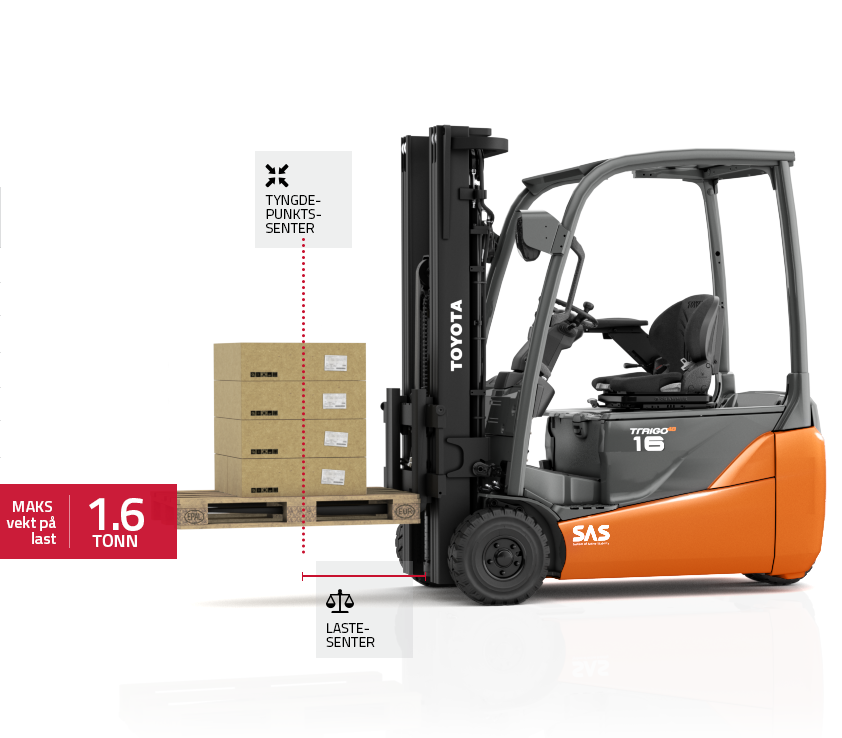 * Nominell løftekapasitet beskriver truckens maksimale løftekapasitet på en last med standard tyngdepunktssenter. Nominell løftekapasitet er gjeldende opp til en viss løftehøyde, så vil den reduseres.
